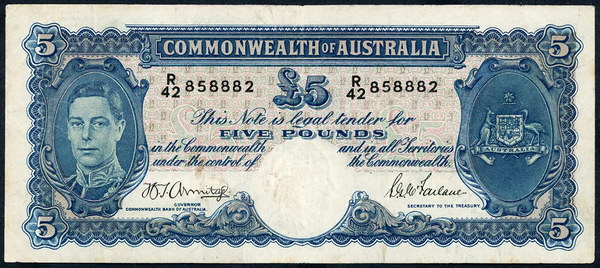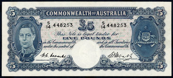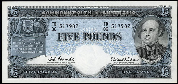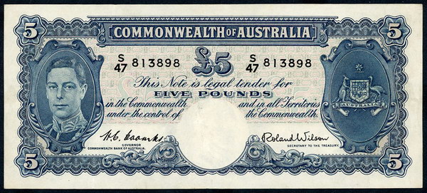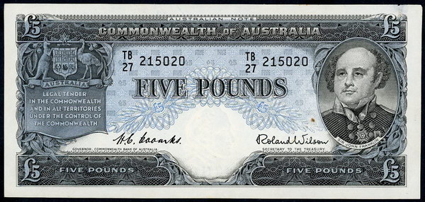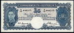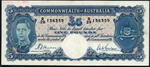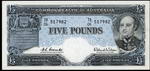 Description: Five Pound. 1954 Coombs-Wilson (R 49). Commonwealth. Flattened, paper thinning at top right and spot.   gVF