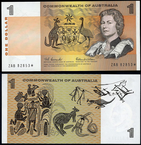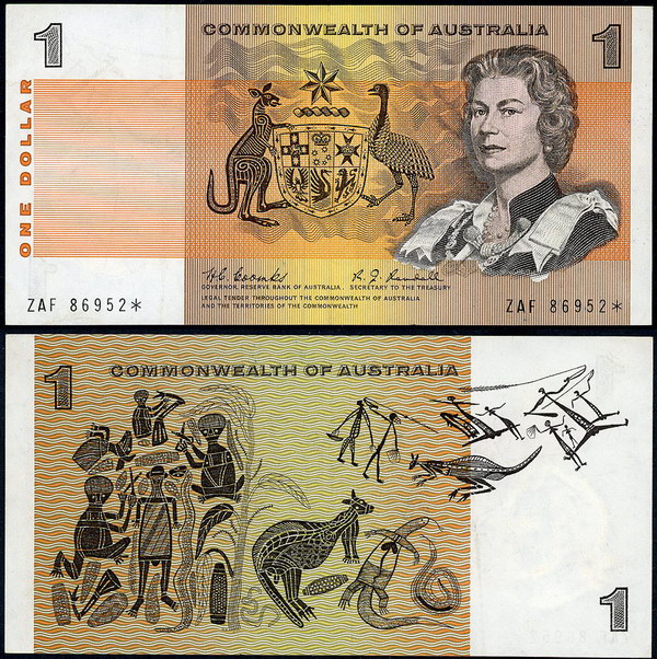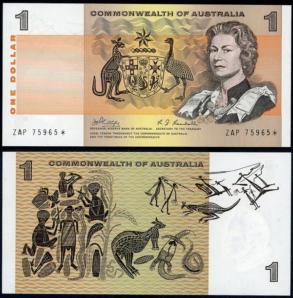 Description: One Dollar. 1972 Phillips-Wheeler (R 74) Commonwealth, 1974 Phillips-Wheeler (R 75) Australia and 1976 Knight-Wheeler (R 76a) centre thread, 1976 Knight-Wheeler (R 76c) Side thread, 1979 Knight-Stone (R 77), 1982 Johnston-Stone (R 78). Most with light folds. (6 notes total).   gEF-UNC