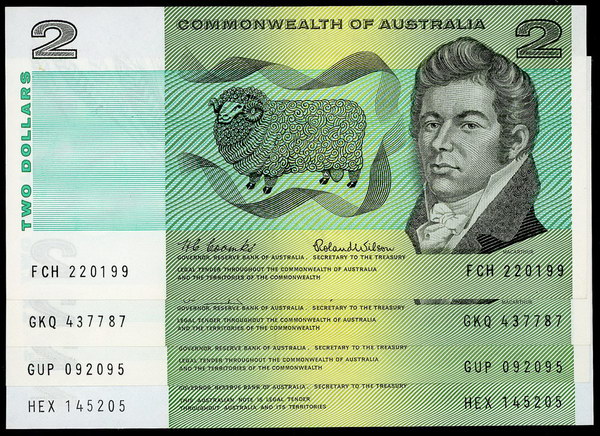 Description: Two Dollar. 1966 Coombs-Wilson (R 81), 1968 Phillips-Randall (R 83), 1972 Phillips-Wheeler (R 84) Commonwealth and 1974 (R 85) Australia. All with a light centre fold and flick. (4 notes total).   aEF-aUNC
