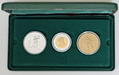 | Description: Sets. 2001 Sir Don Bradman tri-metal 3-coin set; bimetal silver/gold Proof 20 Dollar, silver Proof 5 Dollar and cu/ni Unc 5 Dollar. In single case of issue with COA and dust cover (marks/cracking to case). UNC-FDC |