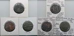 Description: Ancient Byzantine Empire bronze minors: Justin I (491-518AD) bust/large E small A (15mm), (518-527AD) bust/epsilon B (13mm), Justin II (565-578AD) monogram/epsilon (13mm), Maurice Tiberius (582-602AD) bust/large X ANNO (18mm), bust/value (pitted, 19mm), Constantinus (641-688AD) emperor standing/M monogram (20mm) and Manuel I (1143-1180AD) bust/standing (clipped, 17mm). (7 coins total).   G-VG
