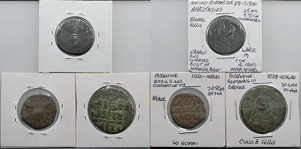 Description: Ancient Byzantine Empire bronze Follis: Anastasius (491-518 AD) bust/large M (25mm), 40 Nummi Basil II/Constantine VII (1020-1028 AD) bust/script in four lines (29mm) and larger Follis Romanus III (1028-1034 AD) bust/script in three lines (pitted, 30mm). (3 coins total).   VG