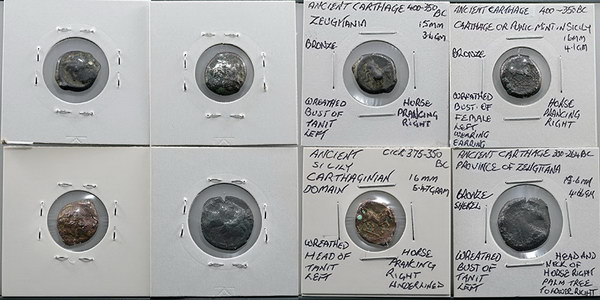 Description: Ancient Carthage Empire bronze minors: Zeugitania (400-350BC) Tanit/horse prancing (15mm), Zeugitania Shekel (300-264BC) Tanit bust/head of horse (18.5mm), Sicily (c375-350BC) Tanit head/prancing horse (16mm) and unknown province (400-350BC) female bust/horse prancing (16mm).   G-VG