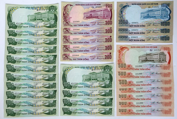 Description: Vietnam South collection: 1000 Dong (P 29), 500 Dong (P 28a) run of 7, 100 Dong (P 26) pair, 20 Dong (P 4a) (2 notes), (P 16a) trio, 10 Dong (P 3a) trio, (P 5a) pair, 5 Dong (P 13) run of 4, 2 Dong (P 12a) run of 4, and 1 Dong (P 1a) run of 4, (P 11a) run of 4. (36 notes total).   EF-UNC
