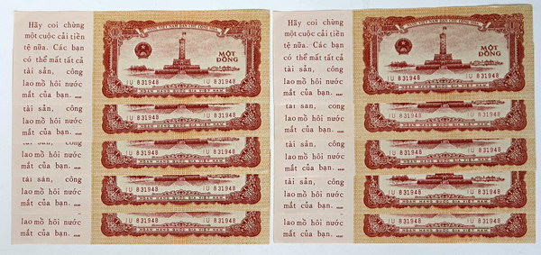 Description: Vietnam War counterfeit lithograph 1 Dong notes (P 71x). With propaganda message at left, code 4540. Matching serials. Made by USA and dropped over Vietnam during the war to demoralise, it reads -Beware another Money Reform. You may lose all your wealth, fruit of your sweat and tears- and on back -The Communist Party is spending your money on a hopeless war. If the war goes on, there will be nothing for you to buy. The war is destroying your country. All your savings will be priceless (typo instead of worthless)-. Light handling. Catalogue at USD $20 each. (10 notes total).   aU-UNC