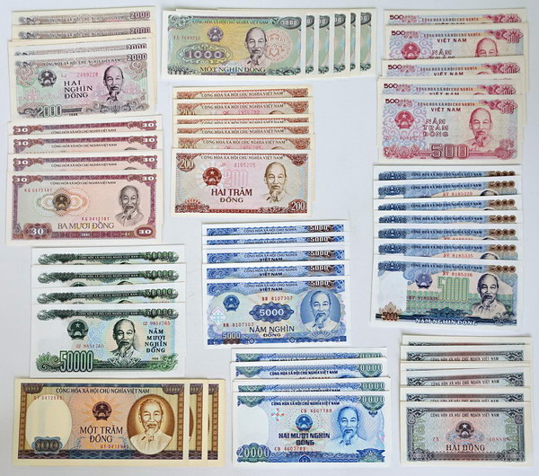 Description: Vietnam collection, 2 Dong to 50,000 Dong 1980s. Includes: 2 Dong (P 85a) (10), 30 Dong (P 87a) (10), 100 Dong (P 88a) (10), 200 Dong (P 100a) (7), 500 Dong (P 101a) (12), 1000 Dong (P 106a) (10), 2000 Dong (P 107a) (10), 5000 Dong (P 104a) (8), 5000 Dong (P 108a) (10), 20,000 Dong (P 110a) (10) and 50,000 Dong (P 111a) (5). Light handling to some. (102 notes total).   gEF-UNC