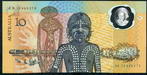 Description: Ten Dollar. 1988 polymer Johnston-Fraser (R 310a). First Issue. Missing final protective varnish layer phase during printing. With information sheet by the late Harold Peake.   UNC