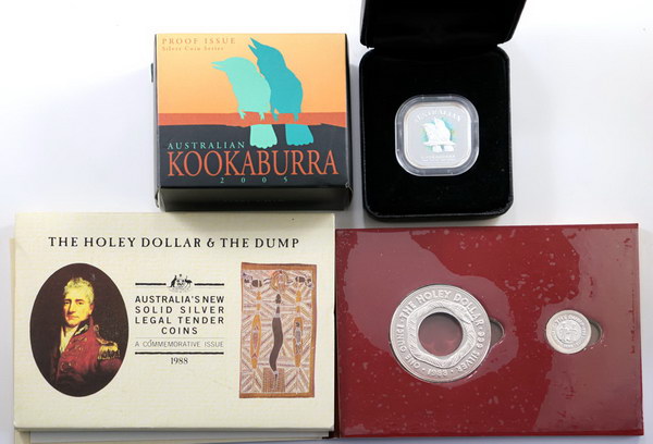 Description: Fifty Cent. 2005 Australian Kookaburra coloured silver Proof 1/2 oz. With case, COA and box (case sticky). Also 1988 Holey Dollar and Dump silver 2-coin set. (2 items total).   FDC
