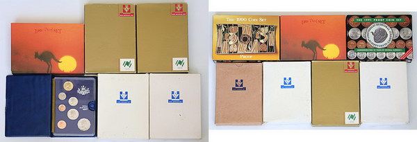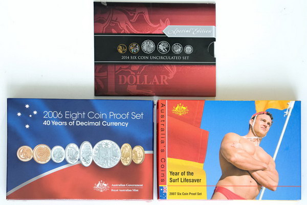 Description: Proof Sets. 2006, 2007 Proof sets. Also 2014 Mint set with coloured Dollar. In packs of issue. (3 items total).   UNC-FDC