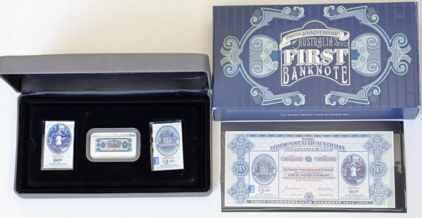 Description: 2013 100th Anniversary of Australias First Banknote 1 oz coloured rectangular silver Proof coin and stamp set. In case of issue.    FDC