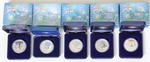 Description: One Dollar. 2004-12 Australian Antarctic Territory coloured 1 oz silver Proofs: 2004 Mawson Station, 2007 Davis Station (minor marks to box), 2009 South Magnetic Pole, 2010 Husky, 2011 Killer Whale, 2012 Emperor Penguin. In boxes of issue with COAs. (6 items total).   FDC