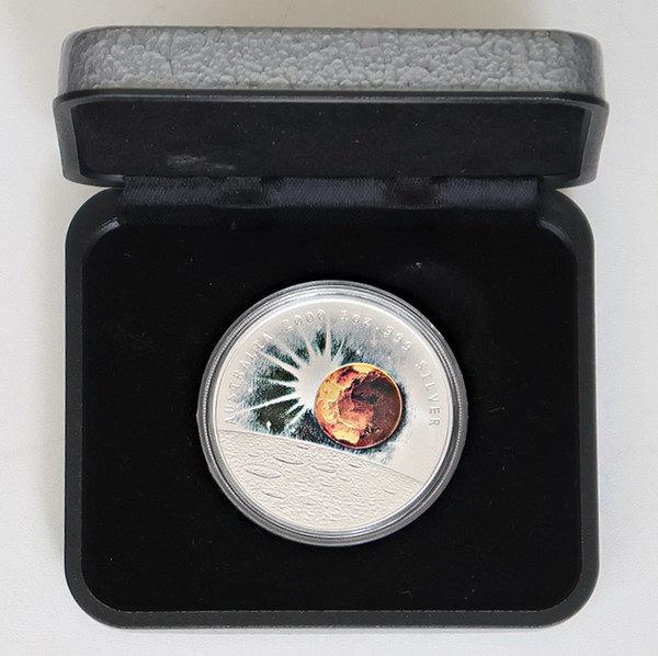 Description: One Dollar. 2000 Millennium Moon, Earth and Sun 1 oz coloured silver Proof. In case of issue with COA and slip case (minor damage).   PROOF-LIKE