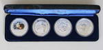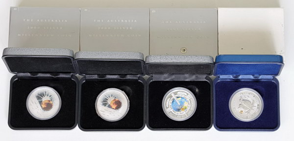 Description: One Dollar. 2000 Millennium 1 oz silver 4-coin set. Includes: Moon, Earth and Sun coloured silver Proof-like and Unc Kookaburra, Lunar Dragon and Kangaroo. In single case of issue with COA (damaged).   UNC-FDC
