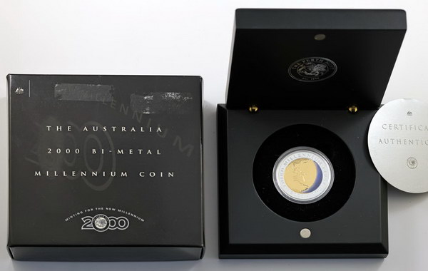 Description: Twenty Dollar. 2000 Third Millennium First Day silver and gold bi-metal Proof. In box of issue with COA (old sticker marks to box).   PROOF-LIKE