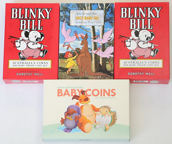 Description: Proof Sets. 2011 (2), 2012, 2021 Baby Proof sets. (4 items total).   FDC