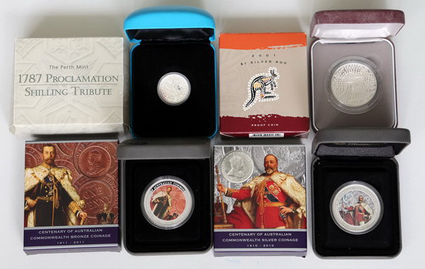 Description: One Dollar. 2008 Proclamation Shilling Tribute silver Proof 50 Cent, 2010 and 2011 Centenary of Australian Commonwealth Coinage 1 oz coloured silver Proofs. Also RAM 2001 Kangaroo 1 oz silver Proof. In boxes of issue wth COA (some environmental marks to case of first). (4 items total).   FDC
