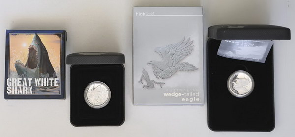Description: One Dollar. 2015 Great White Shark and Wedge-Tailed Eagle High Relief 1 oz silver Proofs. In boxes of issue with COA. (2 items total).   FDC