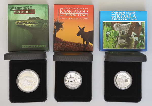 Description: One Dollar. 2015 Australian Koala and Australian Kangaroo High Relief and Saltwater Crocodile 1 oz silver Proofs. In boxes of issue with COA. (3 items total).   FDC