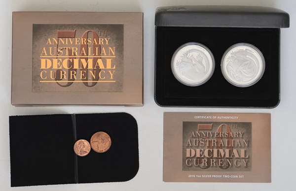 Description: One Dollar. 2016 Decimal Currency 50th Anniversary 2-coin 1 oz silver Proof set; 1 and 2 Cent Reverse design. In box of issue with COA.   FDC