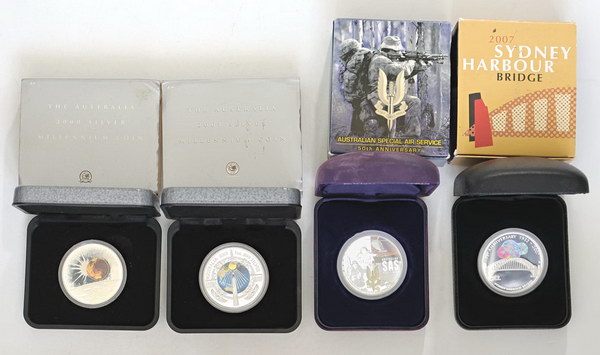 Description: One Dollar. 2000, 2001 Millennium: Earth, Moon, Sun and Cleopatras Needle coloured 1 oz silver Proofs, 2007 SAS and Sydney Harbour Bridge coloured 1 oz silver Proofs. In boxes of issue with COAs (cases sticky, minor damage). (4 items total).   FDC