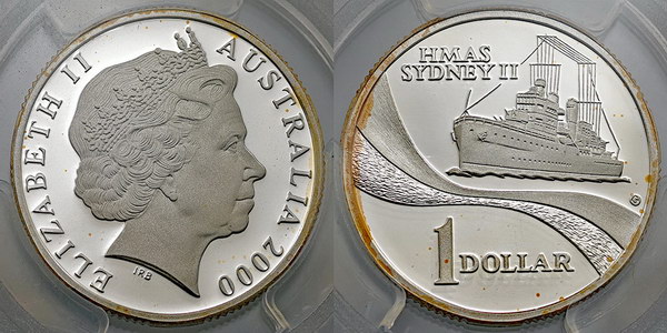 | Description: One Dollar. 2000 HMAS Sydney II silver Proof 1 Dollar. PCGS graded PR 70 DCAM (32131808). The highest possible grade at PCGS. Slight peripheral tone to Reverse. FDC |
