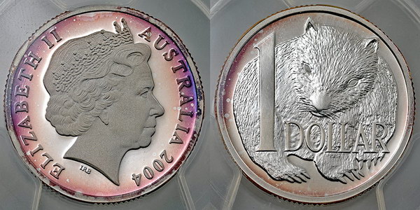 | Description: One Dollar. 2004 Wombat silver Proof 1 Dollar. PCGS graded PR 70 DCAM (80077834). The highest possible grade at PCGS. Slight peripheral tone to Reverse, darker purple tone to Obverse. FDC |