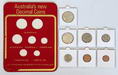 | Description: Sets. 1966 Bank type display of Australias New Decimal Coins; 7 coins including Obverse and Reverse of Round 50 Cent. Coins in flips, with display board separate. Some light tone. (7 coins total). UNC |