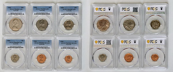 Lot: 1432 Category: Australian Decimal Coins Description: Sets. 1966 Proof set of 6 coins, 1 Cent to Round 50 Cent. PCGS graded PR 68DCAM, 69DCAM, 69DCAM, 69DCAM, 68 RD DCAM and 69 RD DCAM respectively (45525225, 45525254, 37128592, 45525242, 84134566, 45525275). Spot to 2 Cent, very slight hint of tone to 50 Cent otherwise perfect. (6 coins total). FDC Estimate: $800 -$900