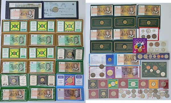 Lot: 1447 Category: Miscellaneous/Unreserved Lots Description: Australia First/Last note and coin packs: 1 Dollar 1984 (9), 2 Dollar (5), 5 Dollar (2), First Fleet Australia Day medallion and stamp issue, 1 Dollar circulated notes (6), Unc Decimal coins in perspex: 1988 Proof 20 Cent, 50 Cent and $1, 50 Cents 1970 (6), $1 1984 (2), Predecimal type sets (3), Decimal set 1981, 3 variety Pennies 1931 dropped 1, 1933/2 overdate and 1942I missing I and assorted 20 Cents loose (17). (36 items total). F-UNC Estimate: $140 -$160