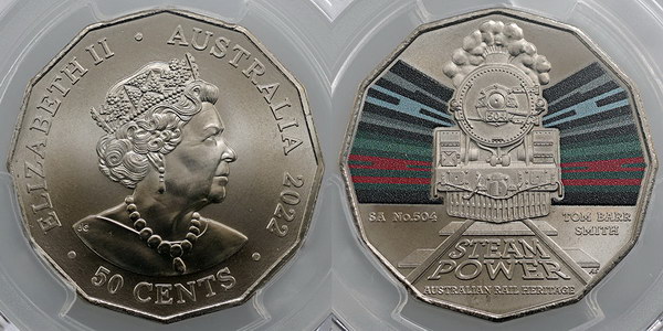 | Description: Fifty Cent. 2022 SA Railways: Tom Barr Smith coloured. PCGS graded MS 69 (45224877). GEM UNC |