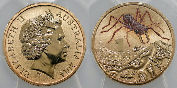 | Description: One Dollar. 2014 Bright Bugs: Red Bull Ant coloured. PCGS graded MS 68 (82272809). GEM UNC |