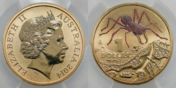 | Description: One Dollar. 2014 Bright Bugs: Red Bull Ant coloured. PCGS graded MS 68 (47655095). GEM UNC |