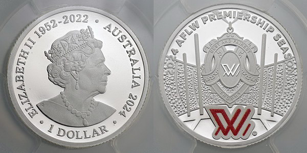 | Description: One Dollar. 2024 AFLW Premiership coloured silver Proof. PCGS graded PR 69 DCAM (54899116). Pop 5, with only five graded higher. GEM UNC |