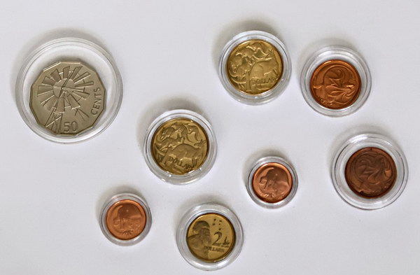 | Description: Assorted. Proof issues from RAM sets: 1 Cent 1981, 1984, 2 Cent 1981, 1988 (toned), 50 Cent 2002 Outback, 1 Dollar MOR 2000, 2010 and 2 Dollar 2000. In capsules only. (8 coins total). FDC |