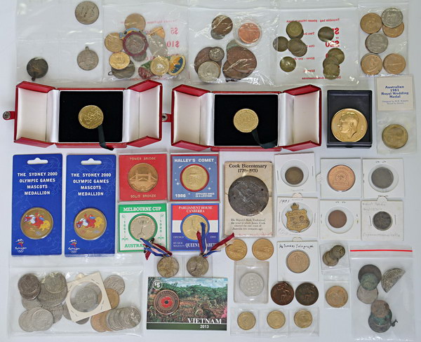 | Description: Small collection of assorted Australian and world medallions, tokens and related. Some to note are: First State 88 and NSW 200 Yrs gold-plated cased, Cook Bicentenary 1970 copper (50mm) on Daily Mirror card, Vietnam 2013 red poppy medallion, Victory medals 1945 (2), 1938 Youth Games (3), Whist token, 1901 Commonwealth medallion, NSW Railways, Victoria Centenary 1934 (2), GB Tower Bridge bronze, Halleys Comet 1986, Melbourne Cup 1988, Parliament House 1988 and many others. (Approx 120 items total). POOR-UNC |