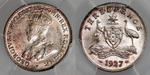 Description: Threepence. 1927. PCGS graded MS 62 (36619953). Attractive tone with bright bloom.   UNC/Ch.UNC