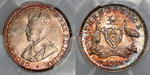 Description: Threepence. 1928. PCGS graded MS 63 (20380031). Striking deep copper/blue cabinet toning with bright bloom.   Ch.UNC