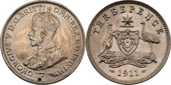 Description: Threepence. 1911. Light tone with some bloom.   aU/UNC
