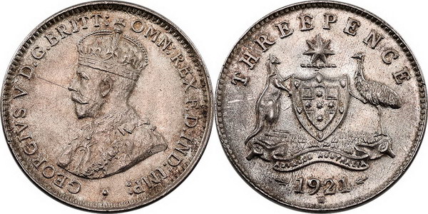 Description: Threepence. 1921M. Light steely tone.   UNC/Ch.UNC
