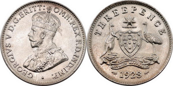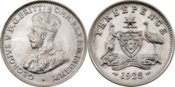 Description: Threepence. 1928. Bright satin mint bloom.   Ch.UNC/GEM