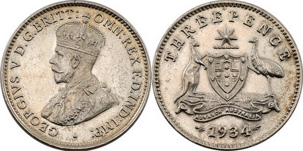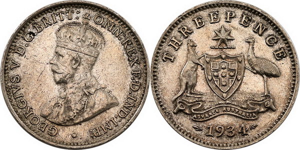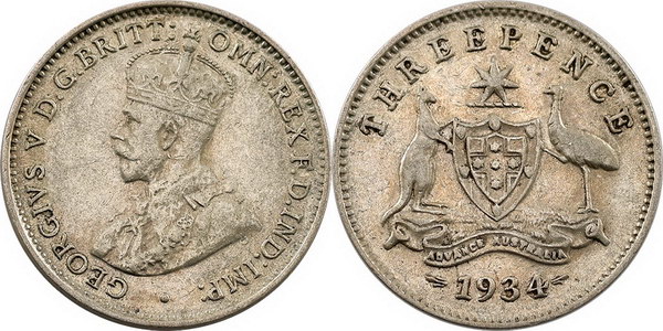 Description: Threepence. 1934/3 Overdate. Toned.   gVF/aEF