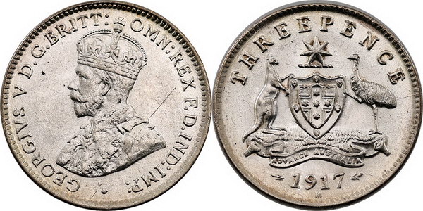 Description: Threepence. 1917M. Bright bloom, some Obverse scratches.   Ch.UNC