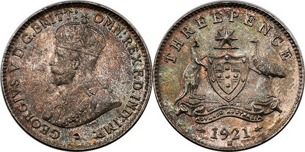 Description: Threepence. 1921M. Old toned.   UNC/Ch.UNC