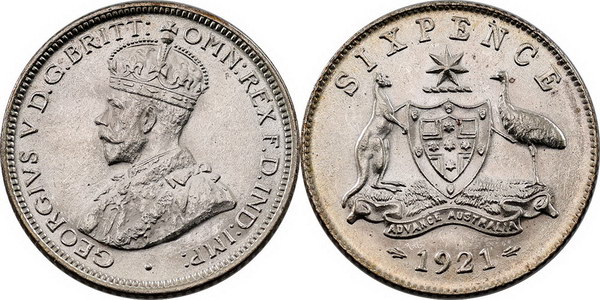 Description: Sixpence. 1920M. PCGS graded MS 63 (33331793). Dark peripheral tone with some bloom. Scarce this grade.   Ch.UNC
