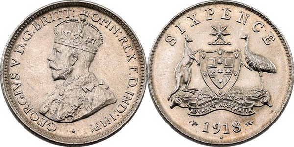 Description: Sixpence. 1918M. Light tone, some Obverse marks.   aUNC