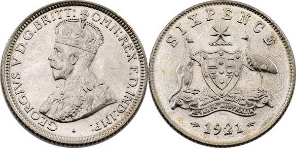 Description: Sixpence. 1921. Orange peel surfaces with bright bloom.   Ch.UNC