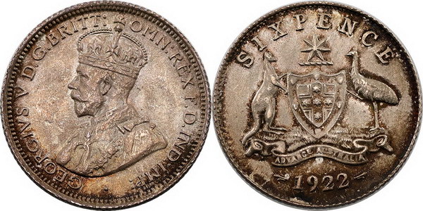 Description: Sixpence. 1922. Scarce date. Old toned, slight Obverse planchet flaw and usual weak Reverse strike.   UNC