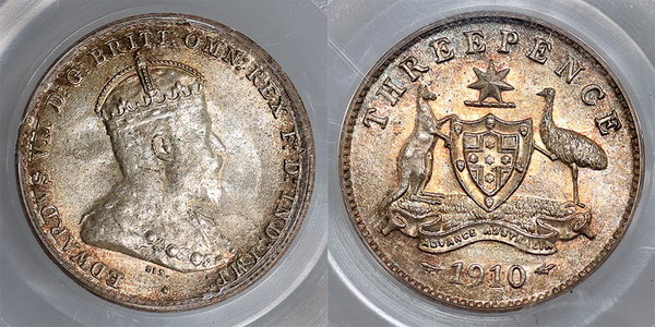Description: Threepence. 1910. Toned with bloom.   Ch.UNC