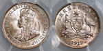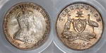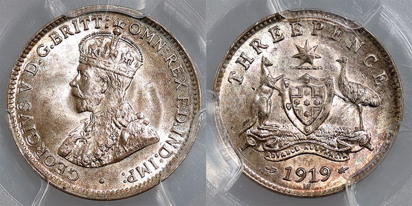 Description: Threepence. 1919M. PCGS graded MS 65 (24820248). Light purplish tone with bloom. Equal second highest, with only 3 graded higher.   GEM UNC