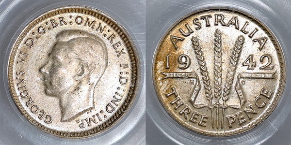 Description: Threepence. 1942M. Key date. PCGS graded MS 63 (19516341). Light tone with significant underlying bloom, and a lovely example of this tough date. Very scarce this grade with only 10 graded higher.   Ch.UNC
